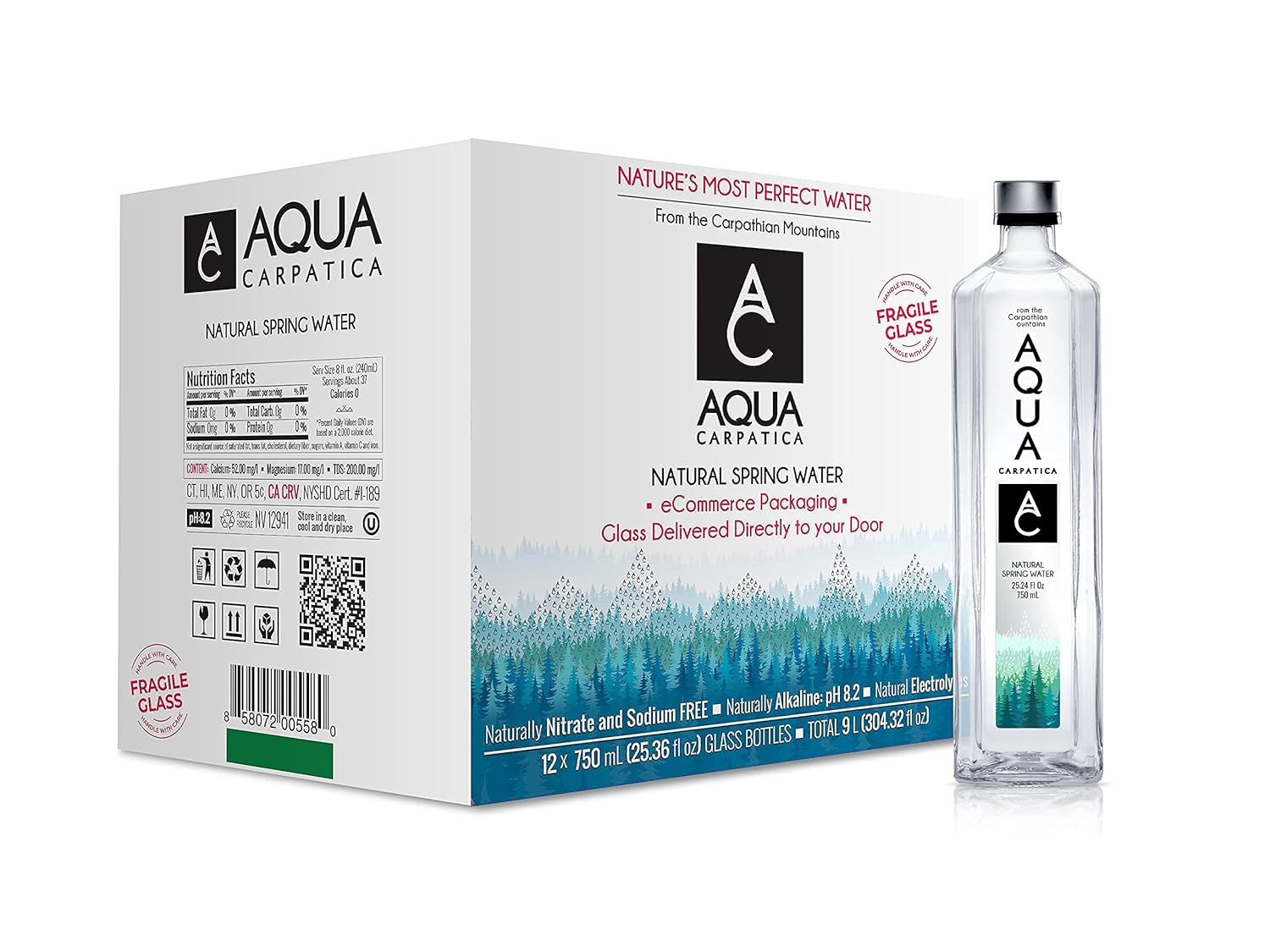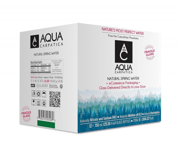 AQUA Carpatica Natural Spring Water with Electrolytes, Artesian Glass Bottled Water, 750 ml / 25.36 oz. (12 Pack)