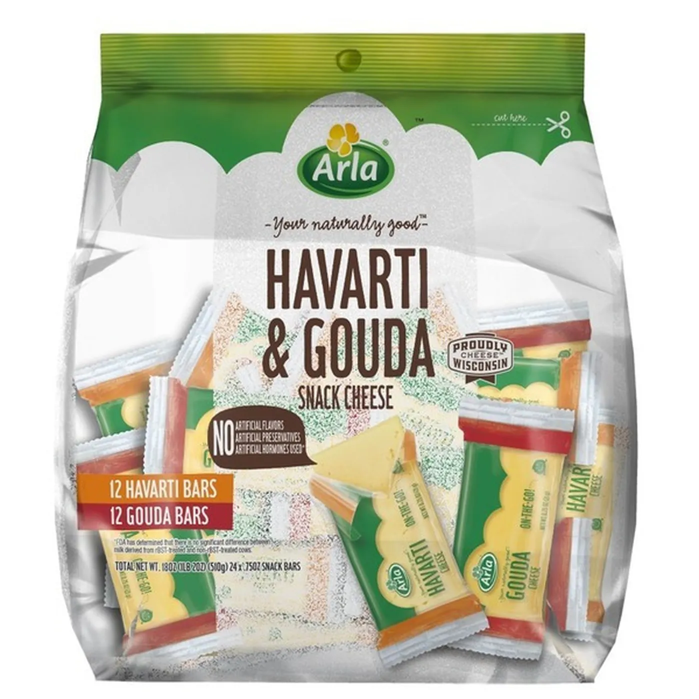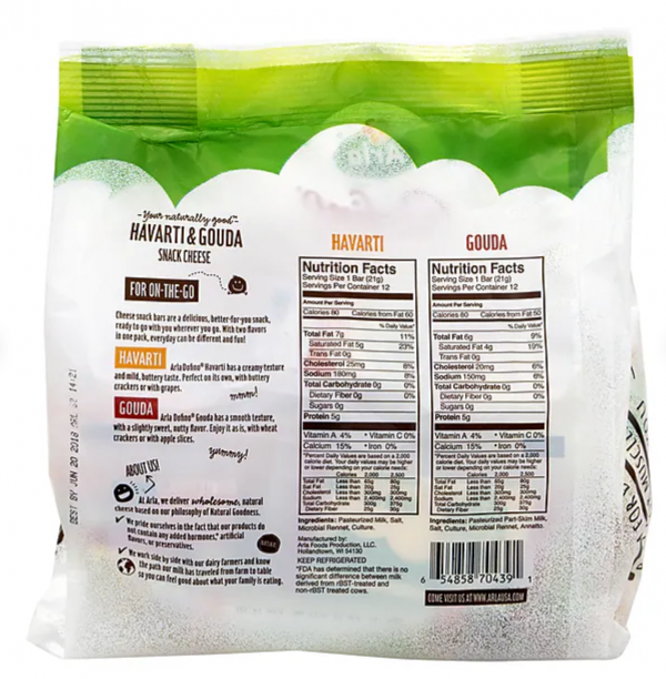 Arla merges two decadent, enjoyable cheeses in one convenient package for on-the-go snacking. You get 12 bars of smooth, slightly sweet and nutty Gouda and 12 bars of creamy, mild and buttery tasting Havarti. Both are made with cows milk from Wisconsin farms without any added hormones, artificial flavors, colors or preservatives. Store these in the fridge and pack in lunches, purses and gym bags for easy, fast snacks.