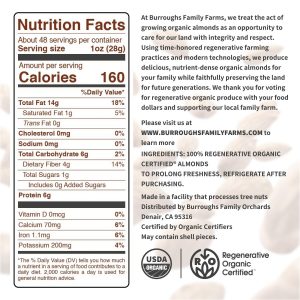 Taste the world’s first Regenerative Organic Certified raw all natural almonds from Burroughs Family Farms – a 100+ year old family farm located in the heart of California. Sustainably grown, these raw organic almonds are pasteurized, eco-conscious, USDA Organic, Regenified Certified, and produced with respect for nature and the planet