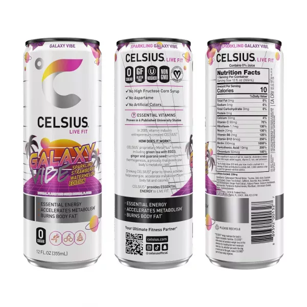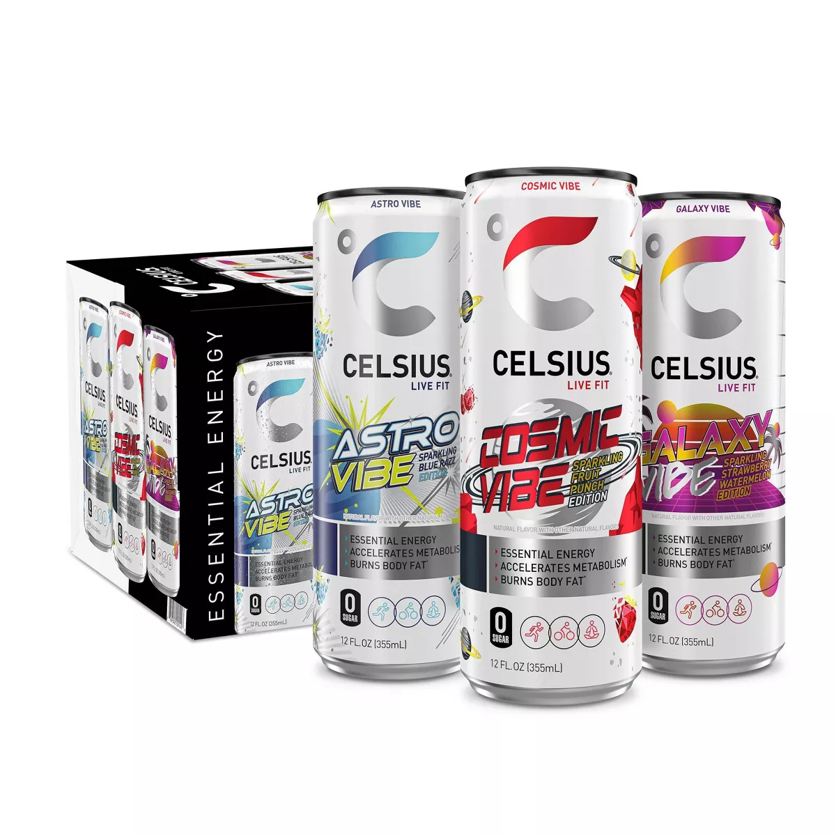 CELSIUS® is functional, Essential Energy, a better-for-you, premium alternative to traditional energy drinks. As a global, lifestyle fitness drink, CELSIUS® was created to help people LIVE FIT, exceed their goals and elevate their everyday lives. Our CELSIUS® VIBE Essential Energy Drinks feature bold flavor combinations that transport you beyond the can to amazing global destinations that inspire us all. From sunny, tropical beaches, to snowy mountainscapes. What’s your vibe? Made with proven, premium ingredients, 7 Essential Vitamins and zero sugar, no artificial colors, no aspartame, no high fructose corn syrup and non-GMO. CELSIUS® is vegan, gluten-free and Kosher. Our proprietary MetaPlus blend contains green tea extract with EGCG. It also includes guarana seed extract, ginger root for flavor and digestion, vitamin C to help support your immune system, vitamin B for energy production, and chromium to help control hunger, making it an ideal pre-workout drink. CELSIUS® Space Variety Pack includes four cans of Sparkling Astro Vibe, Cosmic Vibe and Galaxy Vibe. Made with clinically proven ingredients, these carbonated flavors of CELSIUS® have the perfect balance of flavor and energy that serve as an awesome pick-me-up for active lifestyles. Make CELSIUS® your go to choice for Essential Energy! CELSIUS® is available in 12 Fl Oz slim cans and sold in a 12-pack for convenience.