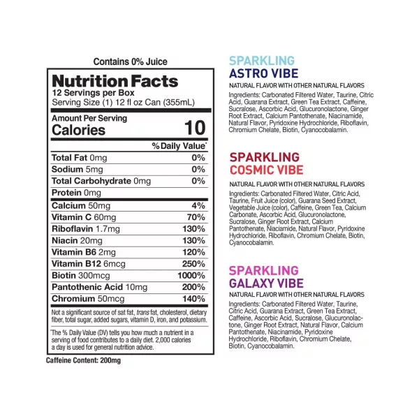 Ingredients: Sparkling astro vibe ingredients: carbonated filtered water, taurine, citric acid, guarana extract, green tea extract, caffeine, sucralose, ascorbic acid, glucuronolactone, ginger root extract, calcium pantothenate, niacinamide, natural flavor, pyridoxine hydrochloride, riboflavin, chromium chelate, biotin, cyanocobalamin. sparkling cosmic vibe ingredients: carbonated filtered water, citric acid, taurine, fruit juice (color), guarana seed extract, vegetable juice (color), caffeine, green tea, calcium carbonate, ascorbic acid, glucuronolactone, sucralose, ginger root extract, calcium pantothenate, niacinamide, natural flavor, pyridoxine hydrochloride, riboflavin, chromium chelate, biotin, cyanocobalamin. sparkling galaxy vibe ingredients: carbonated filtered water, taurine, citric acid, guarana extract, green tea extract, caffeine, ascorbic acid, sucralose, glucuronolactone, ginger root extract, natural flavor, calcium pantothenate, niacinamide, pyridoxine hydrochloride, riboflavin, chromium chelate, biotin, cyanocobalamin.’ ‘