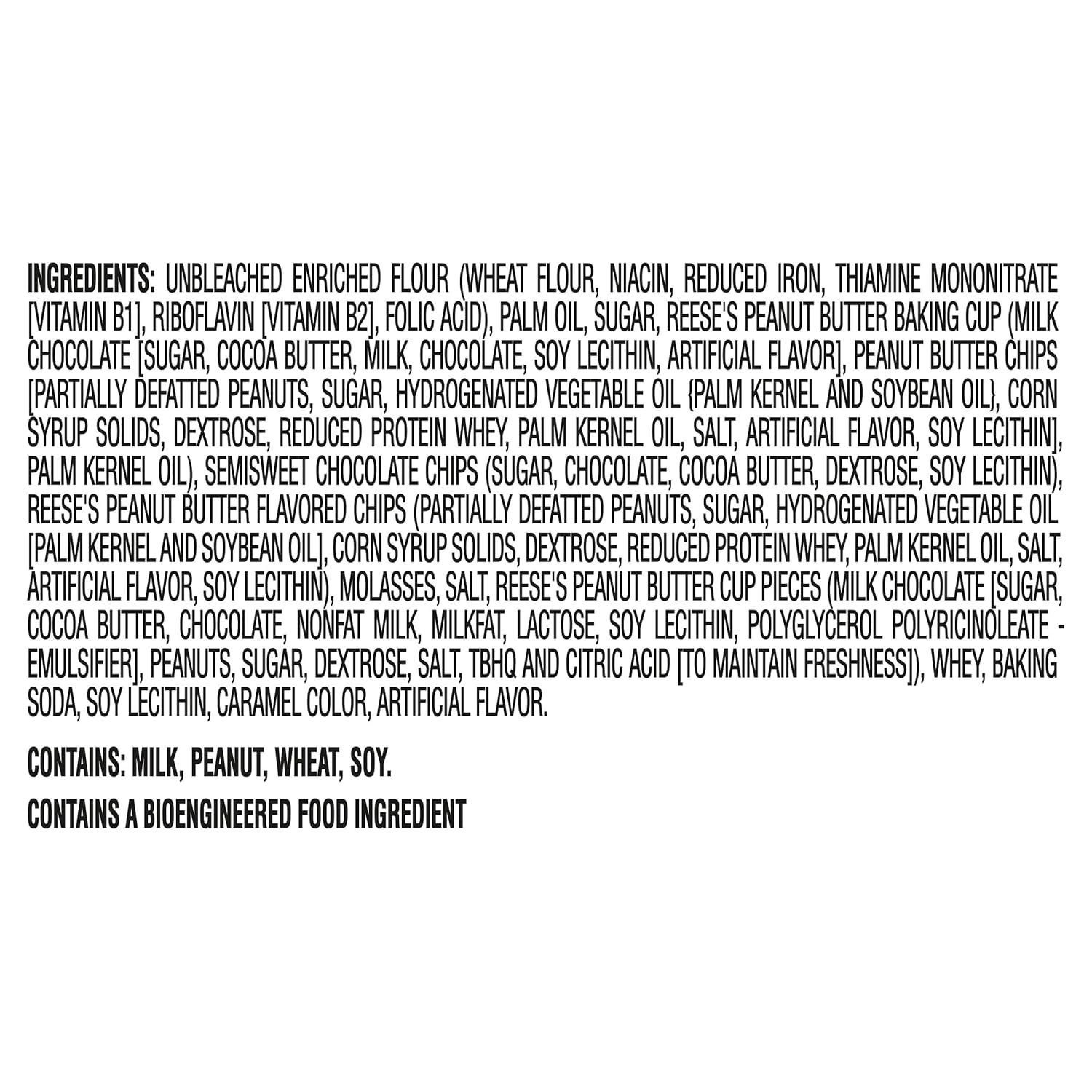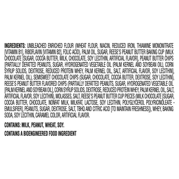 INGREDIENTS: UNBLEACHED ENRICHED FLOUR (WHEAT FLOUR, NIACIN, REDUCED IRON, THIAMINE MONONITRATE {VITAMIN B1}, RIBOFLAVIN {VITAMIN B2}, FOLIC ACID), PALM OIL, SUGAR, REESE’S PEANUT BUTTER BAKING CUP (MILK CHOCOLATE {SUGAR, COCOA BUTTER, MILK, CHOCOLATE, SOY LECITHIN, ARTIFICIAL FLAVOR}, PEANUT BUTTER CHIPS {PARTIALLY DEFATTED PEANUTS, SUGAR, HYDROGENATED VEGETABLE OIL {PALM KERNEL AND SOYBEAN OIL}, CORN SYRUP SOLIDS, DEXTROSE, REDUCED PROTEIN WHEY, PALM KERNEL OIL, SALT, ARTIFICIAL FLAVOR, SOY LECITHIN}, PALM KERNEL OIL), SEMISWEET CHOCOLATE CHIPS (SUGAR, CHOCOLATE, COCOA BUTTER, DEXTROSE, MILK, SOY LECITHIN), REESE’S PEANUT BUTTER FLAVORED CHIPS (PARTIALLY DEFATTED PEANUTS, SUGAR, HYDROGENATED VEGETABLE OIL {PALM KERNEL AND SOYBEAN OIL}, CORN SYRUP SOLIDS, DEXTROSE, REDUCED PROTEIN WHEY, PALM KERNEL OIL, SALT, ARTIFICIAL FLAVOR, SOY LECITHIN), MOLASSES, SALT, REESE’S PEANUT BUTTER CUP PIECES (MILK CHOCOLATE {SUGAR, COCOA BUTTER, CHOCOLATE, NONFAT MILK, MILKFAT, LACTOSE, SOY LECITHIN, POLYGLYCEROL POLYRICINOLEATE – EMULSIFIER}, PEANUTS, SUGAR, DEXTROSE, SALT, TBHQ AND CITRIC ACID {TO MAINTAIN FRESHNESS}), WHEY, BAKING SODA, SOY LECITHIN, CARAMEL COLOR, ARTIFICIAL FLAVOR.CONTAINS: WHEAT, MILK, SOY, PEANUT.