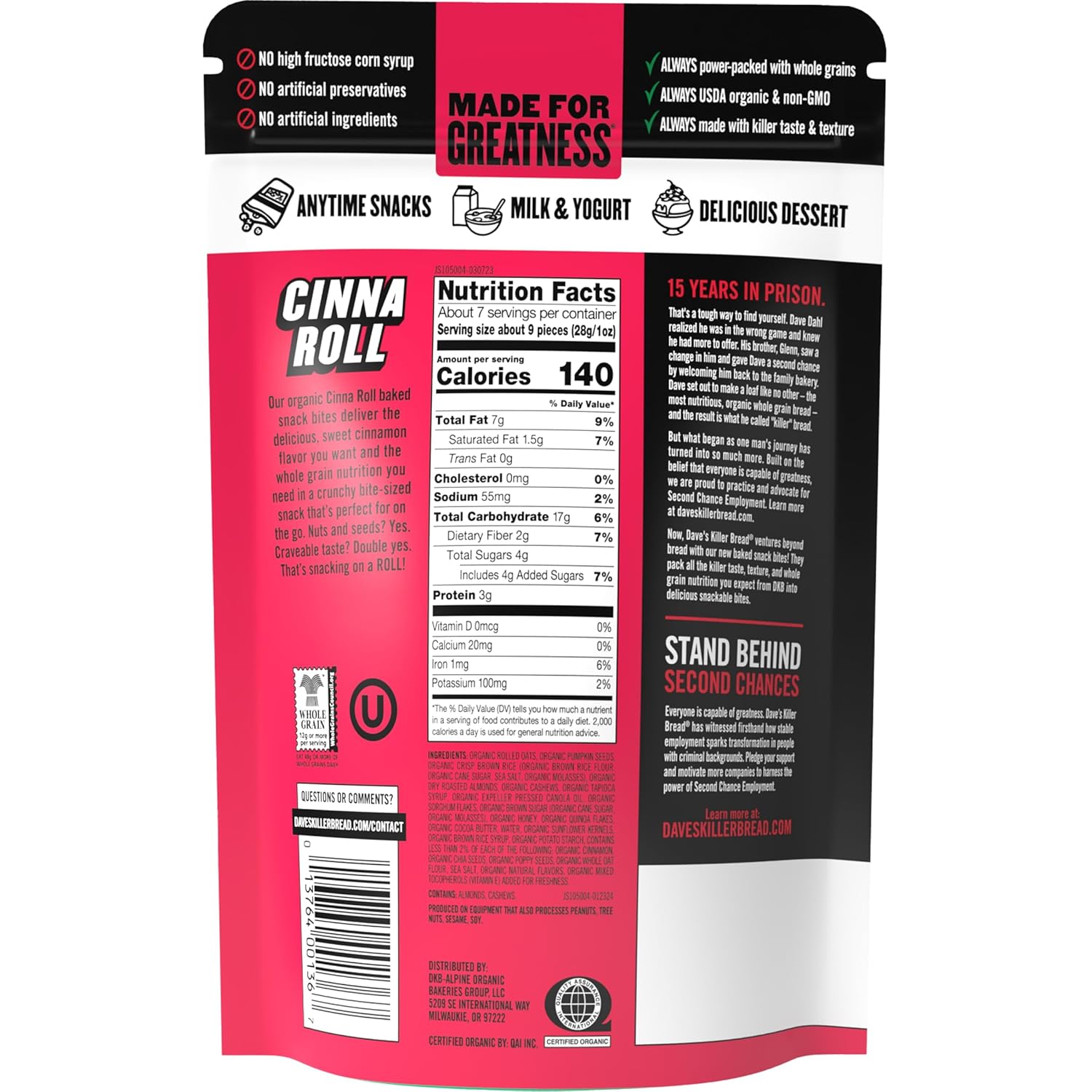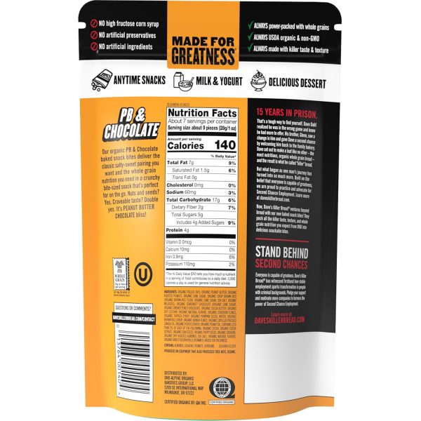 Baked with organic nuts, grains and seeds, Dave’s Killer Bread Organic Snack Bites satisfy your snack cravings while packing the whole grain nutrition you expect from Dave’s Killer Bread. Crunchy, bite-sized organic snacks in a resealable bag are perfect for an on-the-go treat or breakfast. These bites are USDA organic and baked with a killer mix of seeds, nuts, and grains in a perfectly poppable and portable form. Plus, each serving of Non-GMO Project Verified snack bites includes 12g of whole grains and is sure to take your breakfast or snack to the next level. Dave’s Killer Bread Organic Snack Bites have no high fructose corn syrup, no artificial preservatives and no artificial ingredients. You can trust Dave’s Killer Bread to deliver killer taste, texture and whole grain nutrition. The story of Dave’s Killer Bread began at the Portland Farmers Market, when Dave Dahl and his nephew brought some loaves of Dave’s bread to sell. For Dave, this marked the beginning of a new chapter in his life. Though he grew up in a family of bakers, his life took a different path. A path that landed him in prison for 15 years. Determined to prove his worth and make a positive impact, Dave worked tirelessly to bake breads that tasted unlike anything else on the market — packed with seeds and grains, made with only the very best organic and Non-GMO Project Verified ingredients. Dave’s Killer Bread believes everyone is capable of greatness. One in three of the company’s employee partners at their Milwaukie, OR bakery has a criminal background—but your past doesn’t define your future. As a proud Second Chance Employer, Dave’s Killer Bread truly believes everyone deserves a second chance to become a Good Seed.