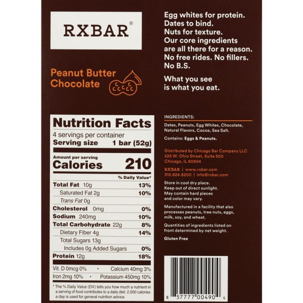 RXBAR Protein Bar, Peanut Butter Chocolate, 4 ct                                                                  Enjoy RXBAR Protein Bar, Peanut Butter Chocolate because it’s a mixture of creamy, tasting peanut butter. This one is so good. Peanut Butter Chocolate mixes irresistible peanut butter with the decadent taste of 100% chocolate. Two great flavors come together to make something even better. Add it to your pantry cupboard or lunch box.