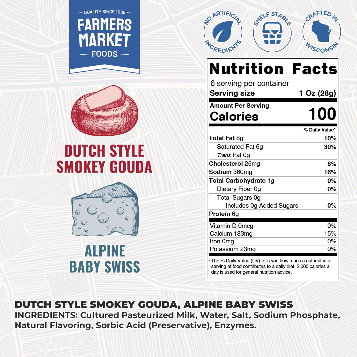 QUALITY WISCONSIN CHEESE. Farmers’ Market cheese blocks by Deli Direct are made from America’s Dairyland Grade A Wisconsin milk, is full of calcium, and has a smooth and creamy consistency.