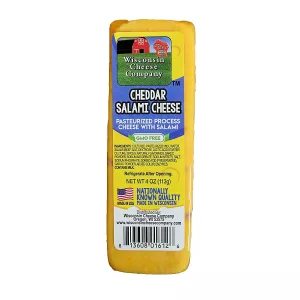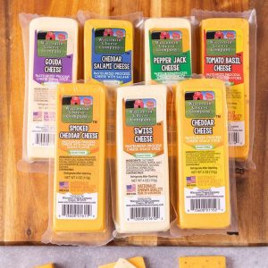 Includes: (7) 4-ounce Blocks of Wisconsin Cheese, flavors including: Cheddar, Swiss, Tomato Basil, Gouda, Cheddar Salami, Pepper Jack & Smoked Cheddar