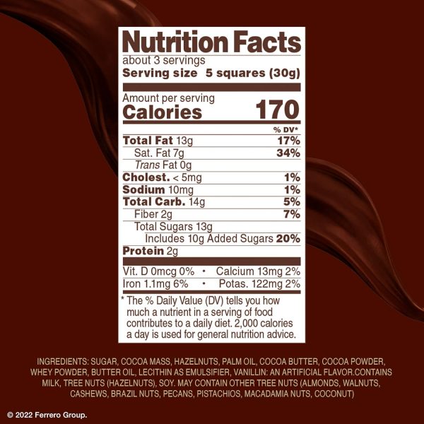 Ingredients: SUGAR, COCOA MASS, HAZELNUTS, PALM OIL, COCOA BUTTER, COCOA POWDER, WHEY POWDER, BUTTEROIL, LECITHIN AS EMULSIFIER, VANILLIN: AN ARTIFICIAL FLAVOR.