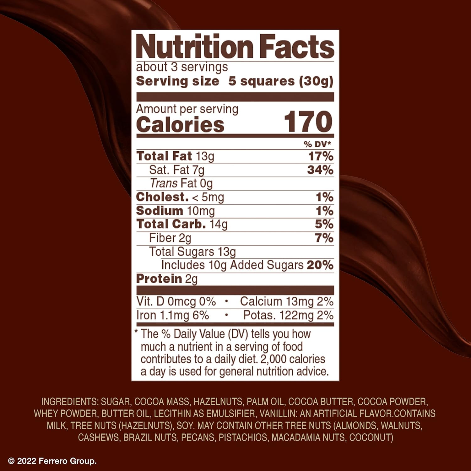 The special taste of Ferrero Rocher now comes in bars for everyday enjoyment. With irresistible layers of texture and flavor, the Ferrero Rocher Dark Chocolate Hazelnut Bar is far from ordinary: enjoy the blend of a smooth 55% cocoa dark chocolate coating together with crunchy roasted hazelnuts and an exquisite creamy filling with hazelnuts. This package includes 8 individually wrapped bars. Made with great attention to detail, each Ferrero Rocher bar features creamy chocolate—milk, dark or white—carefully crafted with selected ingredients. Indulge your senses and tantalize your taste buds—this is an experience to remember. Each Ferrero Rocher bar is made from the highest-quality ingredients and wrapped in gold foil inside a box to protect the taste and quality of the bar. Discover all of the irresistible Ferrero Rocher premium chocolate bars and make any day a reason to celebrate.