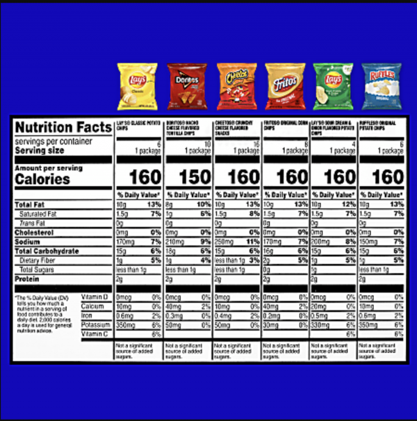 Lay’s Classic Potato Chips: Potatoes, Vegetable Oil (Canola, Corn, Soybean and/or Sunflower Oil), and Salt. Doritos Nacho Cheese Flavored Tortilla Chips: Corn, Vegetable Oil (Corn, Canola, and/or Sunflower Oil), Maltodextrin (Made From Corn), Salt, Cheddar Cheese (Milk, Cheese Cultures, Salt, Enzymes), Whey, Monosodium Glutamate, Buttermilk, Romano Cheese (Part-skim Cow’s Milk, Cheese Cultures, Salt, Enzymes), Whey Protein Concentrate, Onion Powder, Corn Flour, Natural and Artificial Flavor, Dextrose, Tomato Powder, Lactose, Spices, Artificial Color (Yellow 6, Yellow 5, and Red 40), Lactic Acid, Citric Acid, Sugar, Garlic Powder, Skim Milk, Red and Green Bell Pepper Powder, Disodium Inosinate, and Disodium Guanylate. Contains Milk Ingredients. Cheetos Crunchy Cheese Flavored Snacks: Ingredients: Enriched Corn Meal (Corn Meal, Ferrous Sulfate, Niacin, Thiamin Mononitrate, Riboflavin, Folic Acid), Vegetable Oil (Corn, Canola, and/or Sunflower Oil), Cheese Seasoning (Whey, Cheddar Cheese [milk, Cheese Cultures, Salt, Enzymes], Canola Oil, Maltodextrin [made From Corn], Natural and Artificial Flavors, Salt, Whey Protein Concentrate, Monosodium Glutamate, Lactic Acid, Citric Acid, Artificial Color [yellow 6]), and Salt. Fritos Original Corn Chips: Corn, Corn Oil, and Salt. Lay’s Sour Cream and Onion Flavored Potato Chips: Potatoes, Vegetable Oil (Canola, Corn, Soybean, and/or Sunflower Oil), Skim Milk, and Less Than 2% of the Following: Salt, Whey, Onion Powder, Parsley, Sour Cream (Cultured Cream, Skim Milk), Dextrose, Maltodextrin (Made From Corn), Natural Flavors, Medium Chain Triglycerides, Lactose, Citric Acid, Buttermilk, and Whey Protein Concentrate. Ruffles Original Potato Chips: Potatoes, Vegetable Oil (Canola, Corn, Soybean, and/or Sunflower Oil), and Salt.