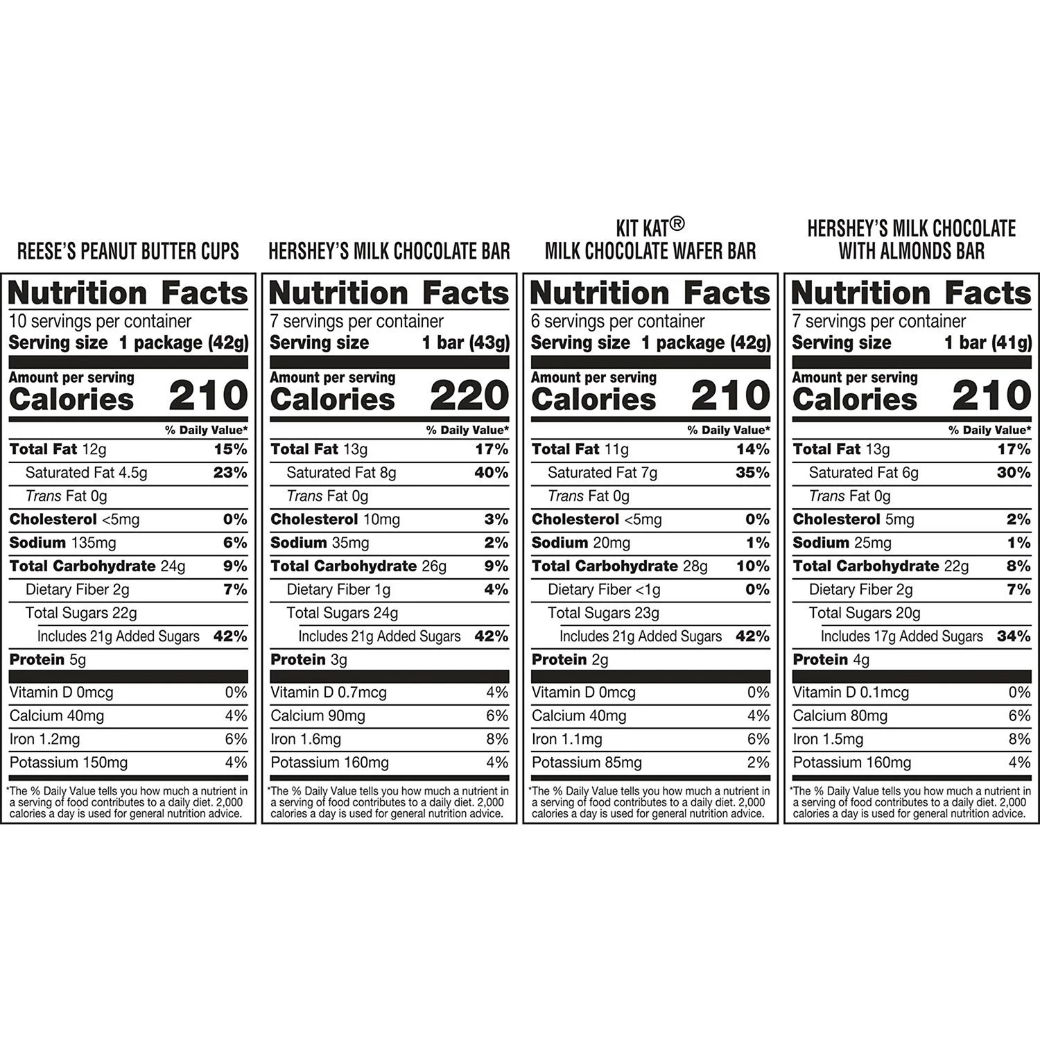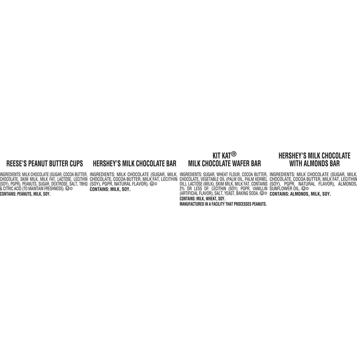 Reese’s peanut butter cups – contains: peanuts, milk, soy., hershey’s milk chocolate bar – contains: milk, soy., kit kat milk chocolate wafer bar – contains: milk, wheat, soy. Manufactured in a facility that processes peanuts., hershey’s milk chocolate with almonds bar – contains: almonds, milk, soy.