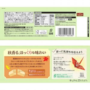 Nestle Kit Kat Mont Blanc is a marron-flavored chocolate base and cream with a hint of rum are sandwiched between wafers. Please enjoy the taste of Mont Blanc, the king of sweets, using chestnuts, the taste of autumn! Mont Blanc is a famous French dessert that consists of a chestnut paste, usually in a mountain shape. This dessert was created in France around the 1600’s but is now more popular in Japan than in any other country. Nestle Japan has captured this classic French dessert perfectly in these new Kit Kats. Chestnut flavoring is mixed into the white chocolate outside, and also chestnut paste holds the wafers together. If you love chestnuts or Mont Blanc, you’ll enjoy these limited edition Kit Kats.