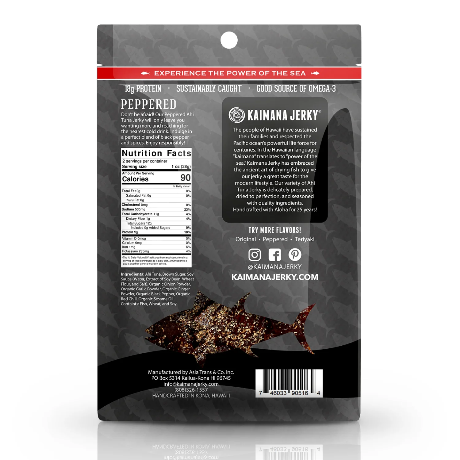 Peppered Ahi Jerky: Seasoned with cracked black pepper for a bold, smoky, and slightly spicy finish.