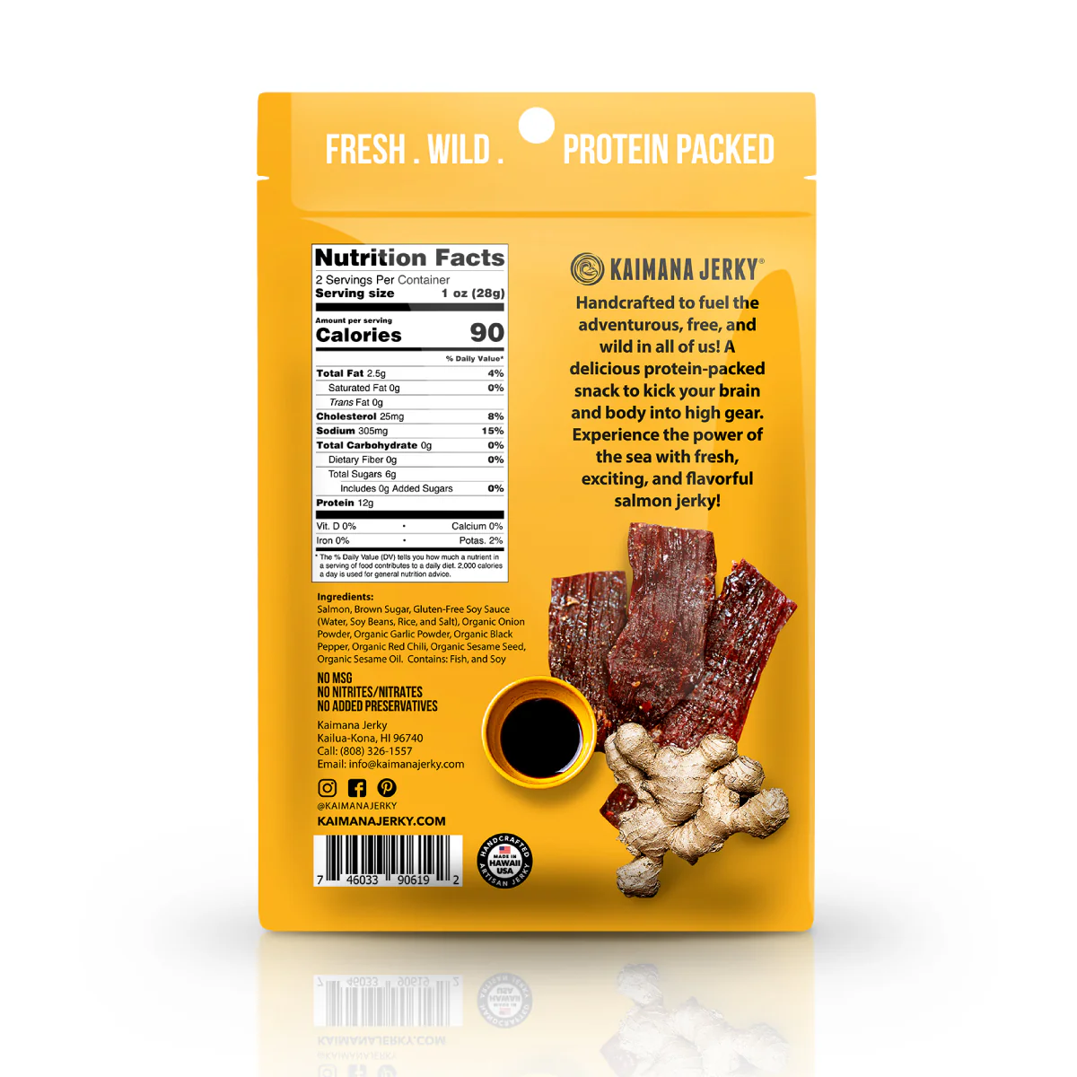 Original Salmon: Salmon, Brown Sugar, Gluten-Free Soy Sauce (Water, Soy Beans, Rice and Salt), Natural Hickory Liquid Smoke, Organic Onion Powder, Organic Garlic Powder, Organic Black Pepper, Organic Chili, Organic Sesame Oil.