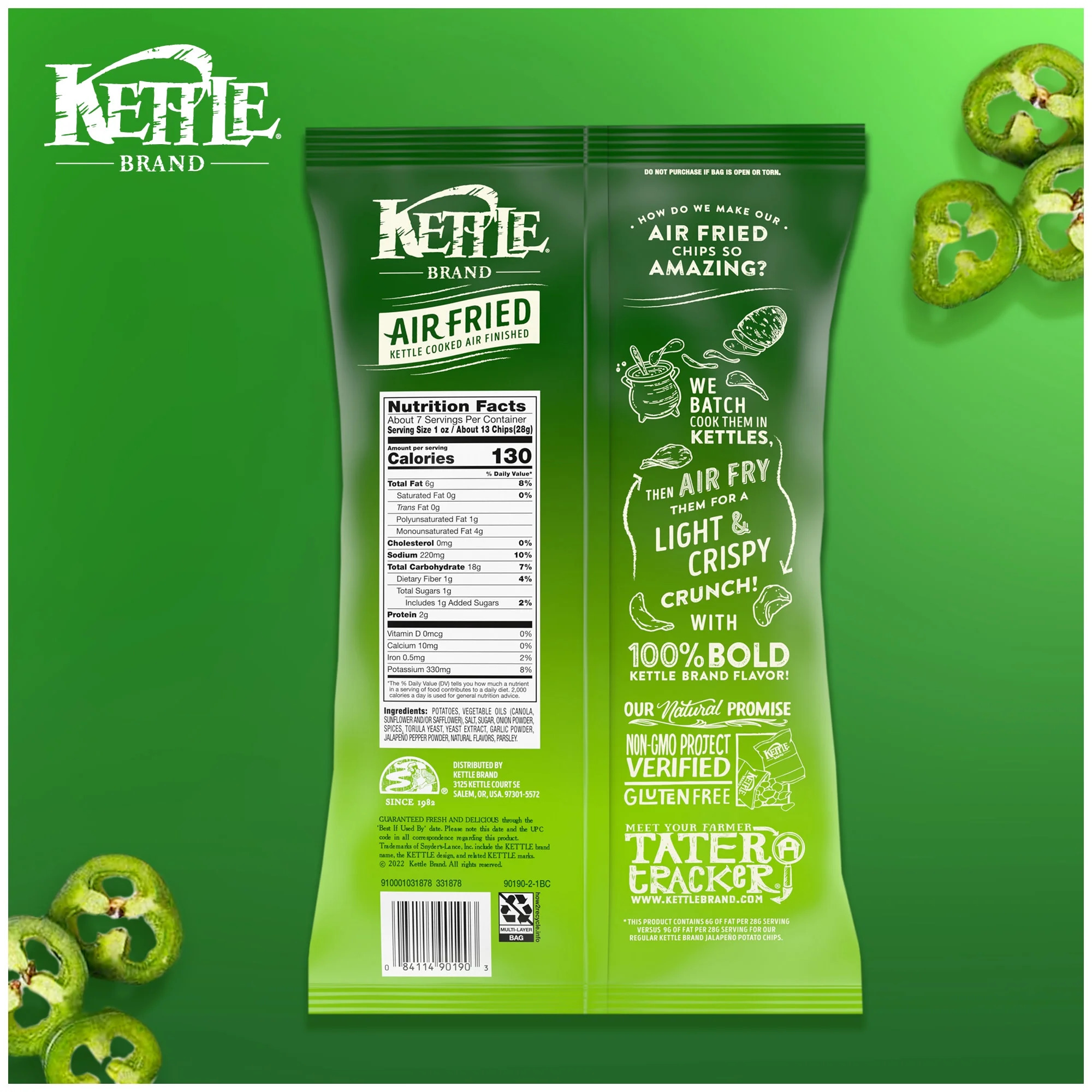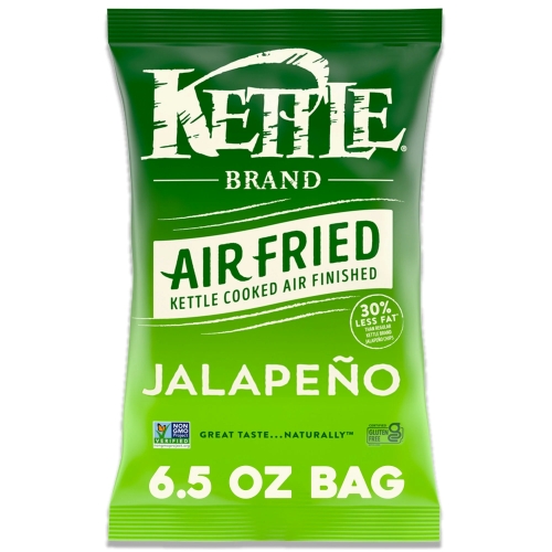 Kettle Brand Air Fried Jalapeno Kettle Chips are kettle cooked, air-fried chips that deliver a light and crispy crunch with no compromise on taste and texture. These zesty chips have 100% bold Kettle Brand flavor with 30% less fat and a lighter texture than our regular Kettle Brand Jalapeno Chips. When you open a bag of our Kettle Brand potato chips, you know you’re getting incredible kettle chips made with authentic recipes by real people. From their farms to our kitchens and then to your home, the time and attention every Kettle Brand worker puts into their products is care you can trust. All that, plus Kettle Brand Air Fried chips deliver a delicious snack that’s Non-GMO Project Verified and Certified Gluten Free. This 6.5-ounce bag of chips is perfect for sharing at parties, tailgates, or just snacking on the couch.