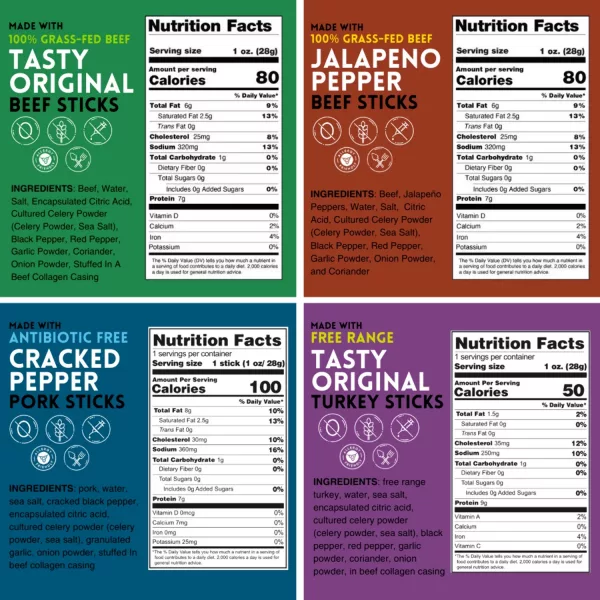 Made in the USA & with only the best Grass Fed Beef, Free Range Turkey, and Non-GMO antibiotic free pork. This is a great way to try the different types yourself or a perfect gift for someone else.
