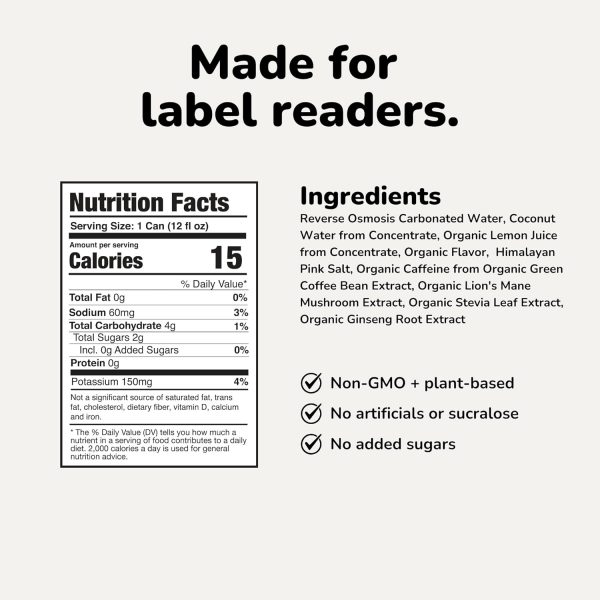 Dragon Fruit: Reverse Osmosis Carbonated Water, Coconut Water from Concentrate, Organic Lemon Juice from Concentrate, Organic Dragon Fruit Flavor, Himalayan Pink Salt, Organic Caffeine from Organic Green Coffee Bean Extract, Organic Lion’s Mane Mushroom Extract, Organic Stevia Leaf Extract, Organic Ginseng Root Extract, Lemon Lime: Reverse Osmosis Carbonated Water, Coconut Water from Concentrate, Organic Lemon Juice from Concentrate, Organic Lemon Flavor, Organic Lime Flavor, Himalayan Pink Salt, Organic Caffeine from Organic Green Coffee Bean Extract, Organic Lion’s Mane Mushroom Extract, Organic Stevia Leaf Extract, Organic Ginseng Root Extract, Pineapple Mango: Reverse Osmosis Carbonated Water, Coconut Water from Concentrate, Organic Lemon Juice from Concentrate, Organic Mango Flavor, Organic Pineapple Flavor, Himalayan Pink Salt, Organic Caffeine from Organic Green Coffee Bean Extract, Organic Lion’s Mane Mushroom Extract, Organic Stevia Leaf Extract, Organic Ginseng Root Extract, Tangerine: Reverse Osmosis Carbonated Water, Coconut Water from Concentrate, Organic Lemon Juice from Concentrate, Organic Tangerine Flavor, Himalayan Pink Salt, Organic Caffeine from Organic Green Coffee Bean Extract, Organic Lion’s Mane Mushroom Extract, Organic Stevia Leaf Extract, Organic Ginseng Root Extract