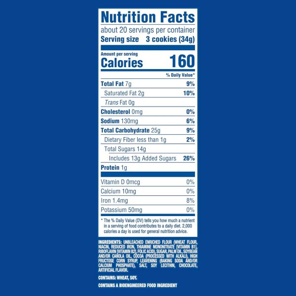 Ingredients: UNBLEACHED ENRICHED FLOUR (WHEAT FLOUR, NIACIN, REDUCED IRON, THIAMINE MONONITRATE [VITAMIN B1], RIBOFLAVIN [VITAMIN B2], FOLIC ACID), SUGAR, PALM OIL, SOYBEAN AND/OR CANOLA OIL, COCOA (PROCESSED WITH ALKALI), HIGH FRUCTOSE CORN SYRUP, LEAVENING (BAKING SODA AND/OR CALCIUM PHOSPHATE), SALT, SOY LECITHIN, CHOCOLATE, ARTIFICIAL FLAVOR.CONTAINS: WHEAT, SOY.