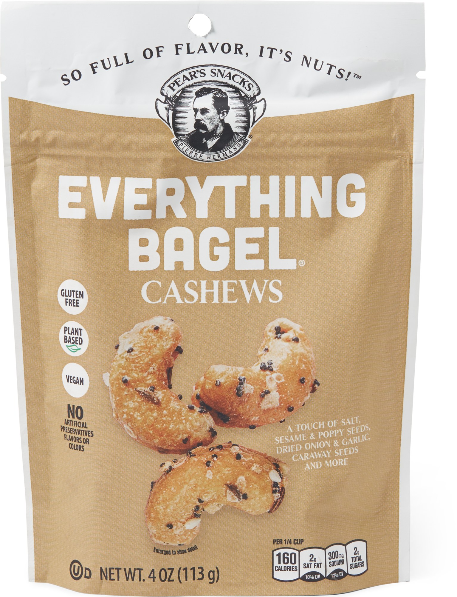 Specifications based on the Everything Bagel Cashews flavor. Nutrition facts displayed here and on wrapper may differ. Info on wrapper reflects actual contents.