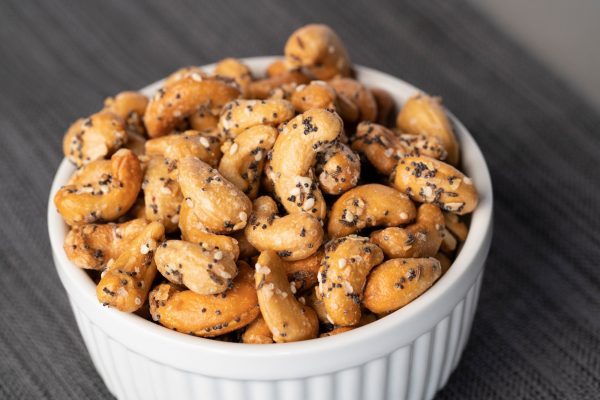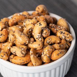 Everything Bagel Cashews ingredients: cashews, peanut and/or sunflower oil, salt, sesame seeds, poppy seeds, dried onion, dried garlic, caraway seeds, corn syrup solids, maltodextrin.