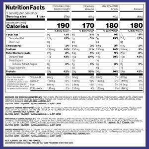 Protein Blend (Milk Protein Isolate, Whey Protein Isolate),Soluble Corn Fiber (Prebiotic Fiber), Almonds, Water, Unsweetened Chocolate, Natural Flavors, Erythritol, Cocoa Butter, Palm Oil, Sea Salt, Calcium Carbonate, Sucralose, Steviol Glycosides (Stevia).