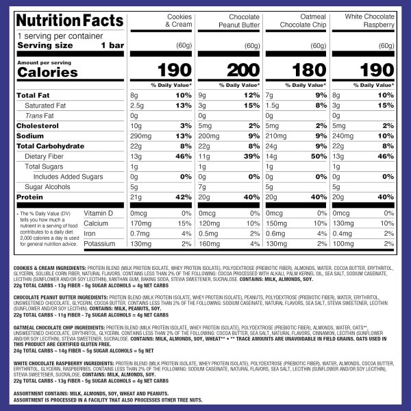 Quest Ultimate Protein Bars Variety Pack brings together the big taste of athlete-worthy nutrition in the original Quest Protein Bars you love. No need to pick your favorite when each bar has the protein and delicious taste you want, without pilling on the sugar and net carbs you don’t. Featuring the great flavors of Blueberry Muffin, Chocolate Brownie, Chocolate Chip Cookie Dough (x2), Chocolate Peanut Butter, Cookies & Cream (x2), Double Chocolate Chunk, Mint Chocolate Chunk, Oatmeal Chocolate Chip, S’mores, and White Chocolate Raspberry. The Ultimate Protein Bars Variety Pack contains 20-21g of protein, 4-5g of net carbs, and 0-2g of sugar per serving.